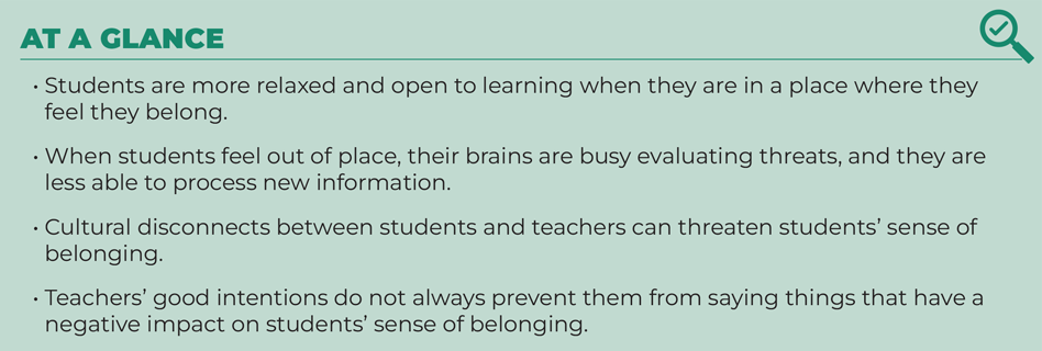Chances are, you feel most relaxed and open to learning in the spaces where you feel you belong. Unfortunately, for too many students, that space is not school. For example, in the first episode of the podcast Belonging, educator and host Erica Young (2022) asks her nephew, a high school freshman and young Black man, “Do you feel like you belong [at your school]?” His immediate reply: “Most definitely not.” He’s not alone in feeling this way. Data from the last 20-plus years consistently reveal that students who are not white, who speak English as a second language, who have disabilities, who identify as LGBTQIA+, or who are impacted by poverty feel a deep sense of not belonging. They feel excluded and marginalized in the space where they spend a significant proportion of their daily lives (Coles, 2019; Jenkins, 2022).