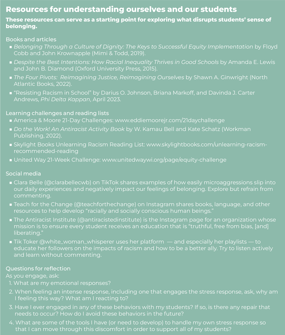 The reality is that all educators, especially white ones, have deeply internalized implicit biases that come from media and personal interactions. These at times manifest in words and actions that are racist, ableist, or classist. Whether because we are unaware of the history of a common phrase — as was the case with the teacher who used the phrase cotton-picking — or because white, ableist, or classist norms inform what is and is not acceptable behavior in school, most educators will at some point engage in a behavior that marginalizes or excludes some students. If we want our actions to match our intentions, we must shatter the good/bad, racist/not racist dichotomy and be willing to hear when our words and behaviors have created a barrier to students’ sense of belonging. The resources listed on page 23 can help us understand how our actions might affect our students, despite our best intentions. We also must build our awareness of and an ability to regulate our stress response so that we can do the work of dismantling what we have internalized. As we decenter ourselves, we can better turn our attention to our students and learn from and with them.