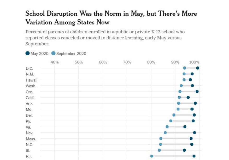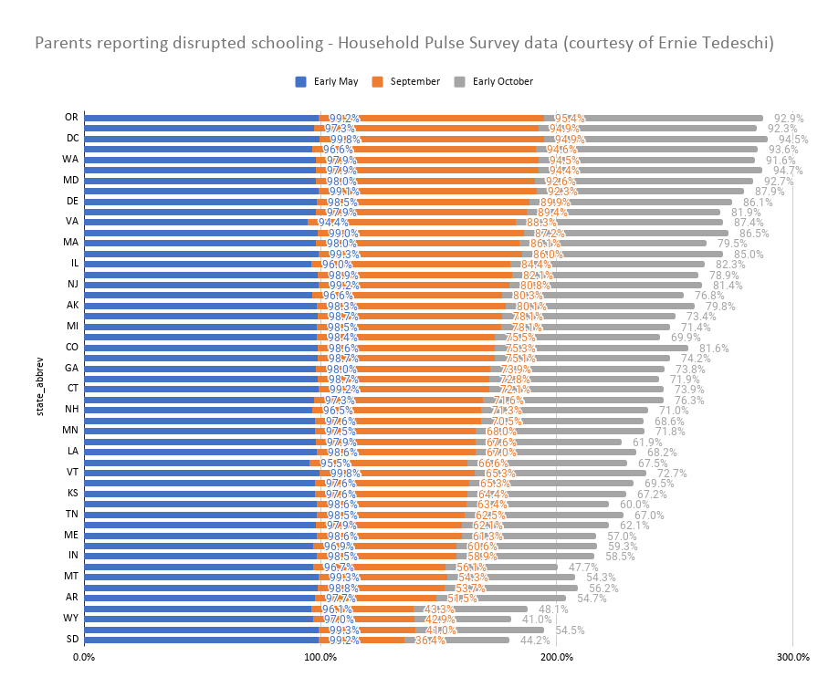 As you may recall, Tedeschi published a story in the New York Times using the HPS data to show changes in the level of school disruption in various states from May to September:
