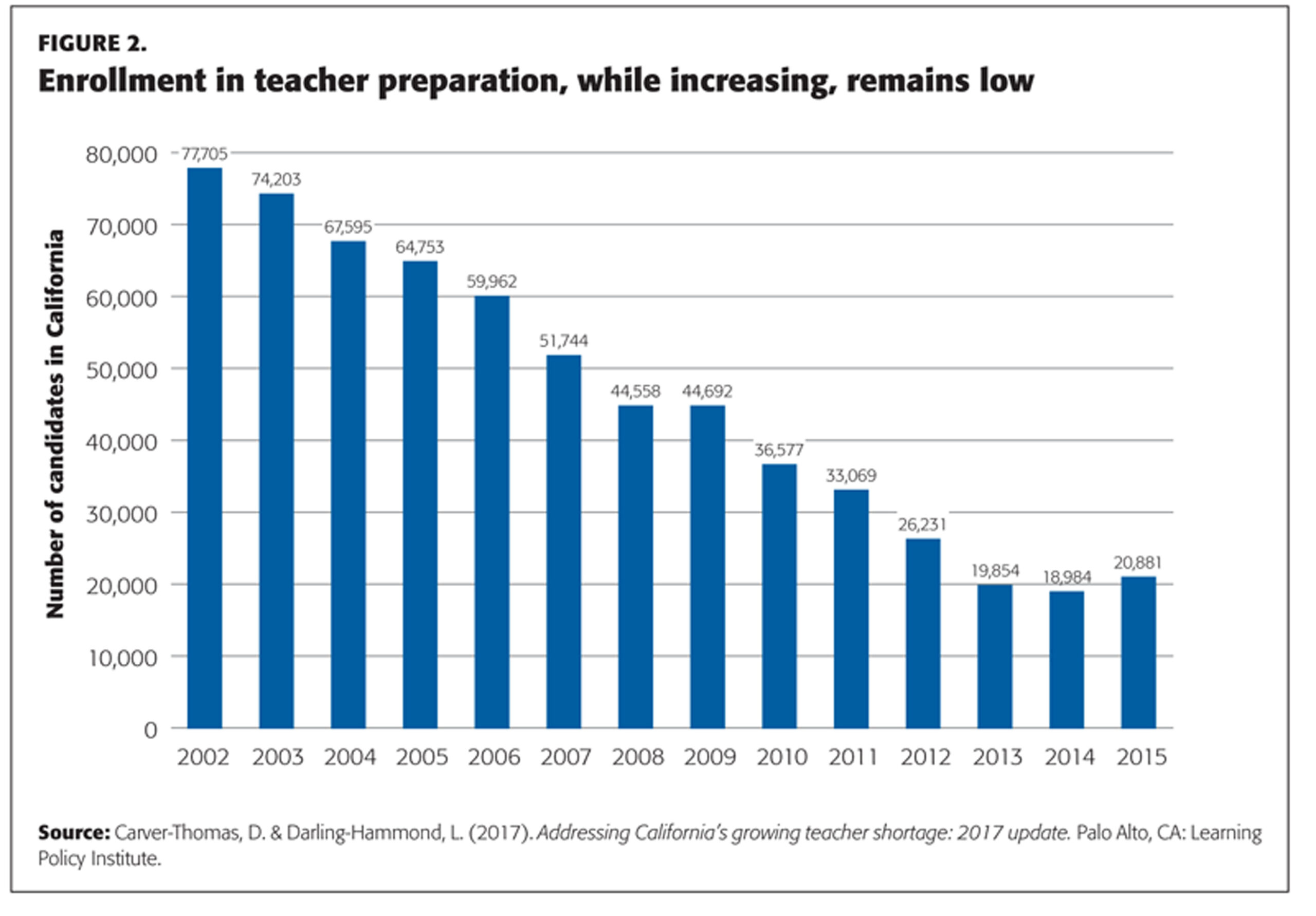 The effects weren’t felt immediately, however. The Great Recession led to sharp budget cuts, which forced many districts to stop hiring new teachers and, quite often, to lay off veteran teachers. Recent research from the Learning Policy Institute shows that by 2011-12, the state had lost nearly 9% of its teaching positions, which effectively canceled out the previous demand for new teachers. Not surprisingly, enrollment in teacher preparation programs steadily declined as well, from a high of nearly 78,000 candidates in 2001-02 to less than a quarter as many in 2013-14. (See Figure 2.)
