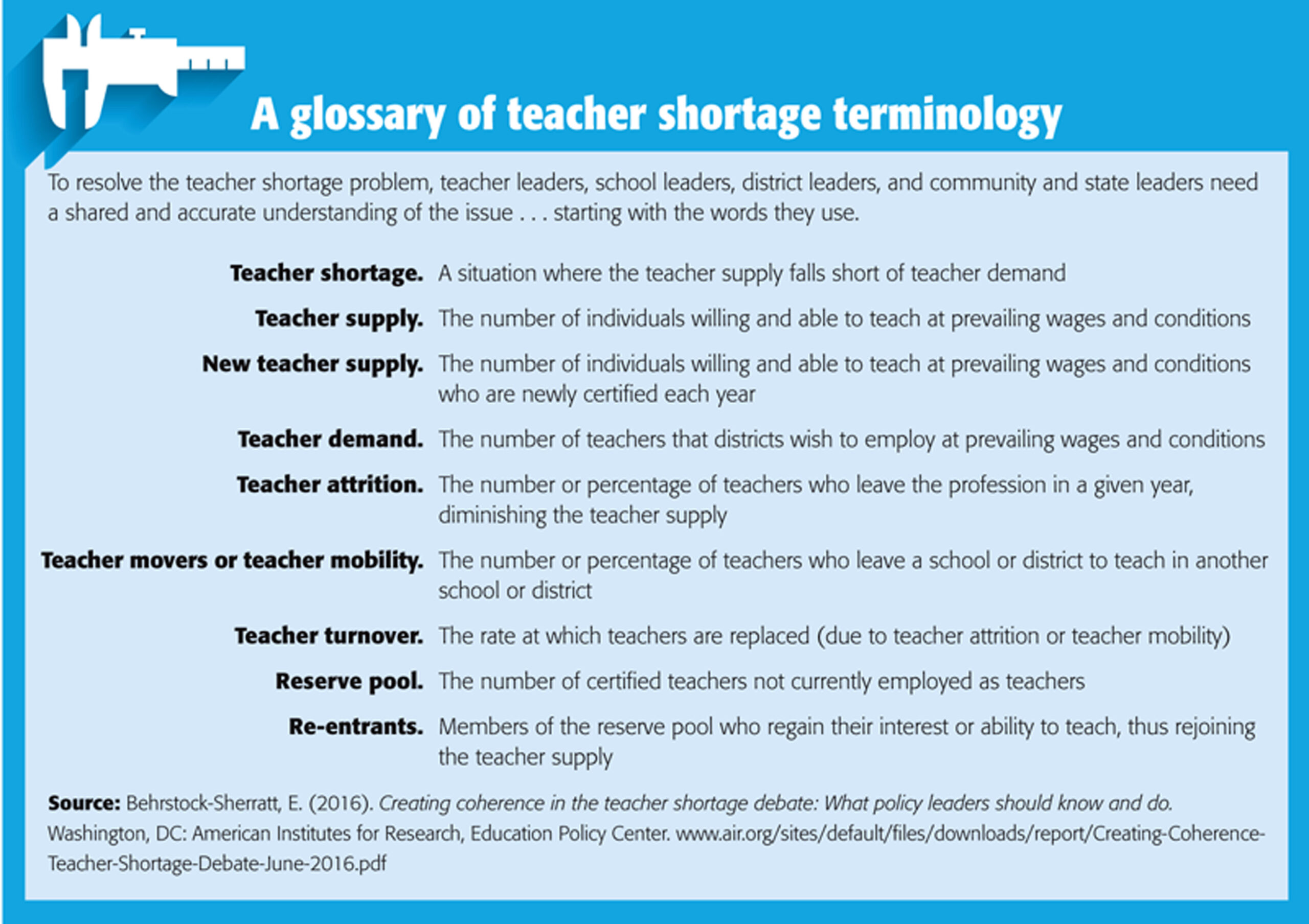 Sutcher, L., Darling-Hammond, L., & Carver-Thomas, D. (2016). Coming crisis in teaching? Teacher supply, demand, and shortages in the U.S. Palo Alto, CA: Learning Policy Institute.