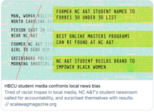 | What happens when student journalists realize that local coverage in HBCU towns are racist? In at least one case, they study the problem, confront the outlets contributing to the problem, and generate changes in the coverage (H/T Carla Murphy). |