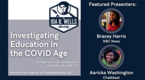 | Above: Last spring, the Ida B. Wells Society put on a webinar about schools and COVID that featured the New York Times’ Nikole Hannah-Jones and Erica Green. This week, the organization put on another webinar on school COVID coverage featuring NBC News’ Bracey Harris and Chalkbeat Indiana’s Aaricka Washington that includes a slide advising reporters to “Think about what truly makes you angry” and “Tell the story that only you can tell.”