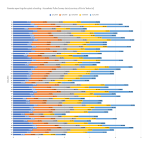 | Above: Data from the Census Bureau’s Household Pulse Survey, courtesy of Ernie Tedeschi, shows consistently high rates of school disruption reported by parents in some states, and varied rates by month in several others.