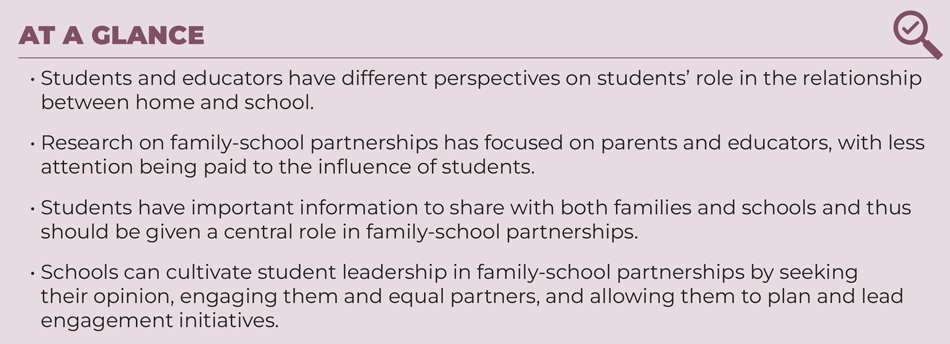 Positive student perceptions of family engagement in their education have been linked to student achievement and well-being (Epstein & Sheldon, 2023; Thomas et al., 2020). For this reason, developing positive student leadership experiences in family-school partnerships can enhance student perceptions and achievement.