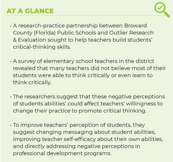 These findings left us asking what we could do to improve teachers’ perceptions of their students’ abilities and, by extension, their willingness to change their practices to promote more critical thinking.