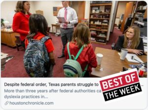 | 🏆 BEST: The best education story of the week is Despite federal order, Texas parents struggle to win services for dyslexic students by Shelby Webb in the Houston Chronicle. Webb speaks to parents whose kids have struggled to get the services they need to succeed in school more than three years after federal officials called out Texas’ dyslexia practices following a Chronicle investigation. “Investigators found about 20 percent of dyslexic students received special education services, while many more were given reading interventions or offered minor accommodations,” Webb writes. “Little has changed.” In a recent story we published on how to cover literacy, reporters recommended interrogating state policies. Webb does exactly that in this piece and holds officials accountable.
