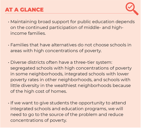 Integration and segregation patterns in these districts also suggest that families support integrated schools as long as the schools their children attend are in their communities and the poverty levels at those schools remain moderate. It is not unusual for diverse districts to have a three-tier system: segregated schools with high concentrations of poverty in some neighborhoods, integrated schools with lower poverty rates in other neighborhoods, and schools with little diversity in the wealthiest neighborhoods because of the high cost of homes.