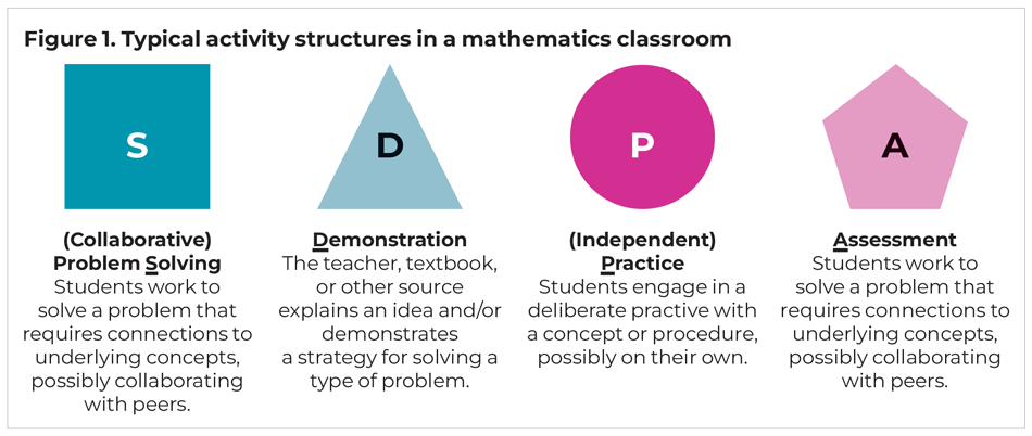 To help consider what balanced instruction might look like, let us assume that we can sort all instruction into a few activity structures: (collaborative) problem solving, demonstration, (independent) practice, and assessment (see Figure 1).