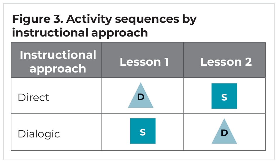 To help consider this, let’s examine how teachers might sequence a single pair of activity structures (see Figure 3). In the direct instruction classroom, the teacher shows students something in Lesson 1 and then asks them to apply it in Lesson 2. In the dialogic classroom, students engage in inquiry in Lesson 1. Then, in Lesson 2, the teacher shares information that supplements their work in Lesson 1 (Schwartz & Bransford, 1998).