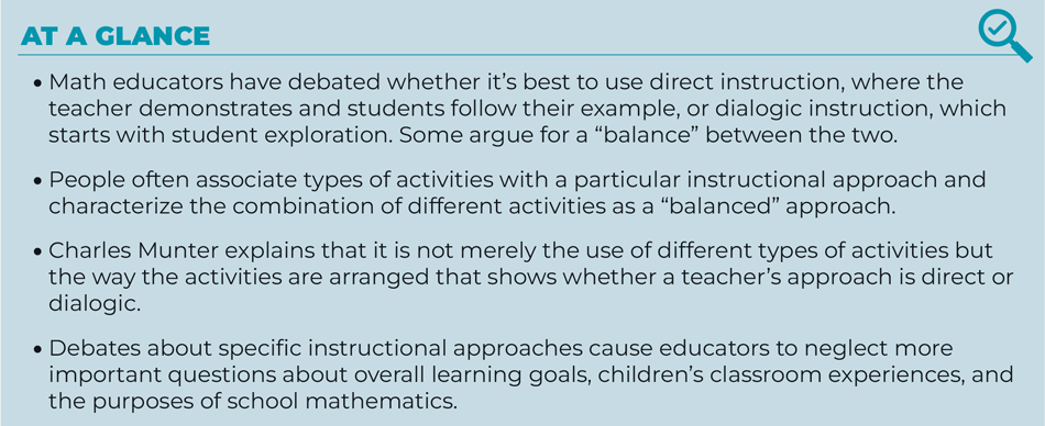 These appeals for “balance” have not been limited to conversations about types of knowledge or proficiency to include in students’ mathematics learning. They have also shown up in conversations about teaching, where the field has reached less consensus. One impulse has been to look for a “balance” between competing instructional approaches. But what does that really mean for the day-to-day work of classroom teaching? Is such an instructional balance possible? And are there more important questions we should be considering?