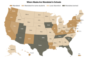 Above: Check out the New York Times map of school mask mandates and guidance in each state. For more resources, see Burbio’s school closure map, Education Week’s teacher vaccination policy tracker, and CRPE’s new update on district reopening practices.