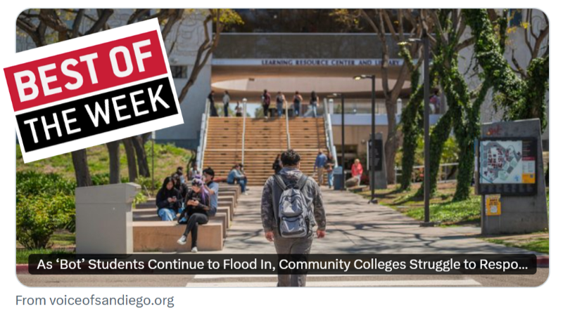 The best education journalism of the week is As ‘Bot’ Students Continue to Flood In, Community Colleges Struggle to Respond by Voice of San Diego’s Jakob McWhinney.