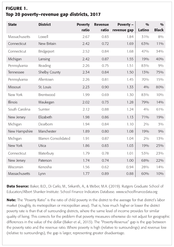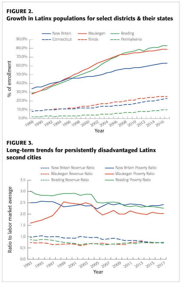 As found in the earlier research, many of these disadvantaged districts are located in second cities in states like Connecticut, Illinois, Pennsylvania, New York, and Massachusetts. Some of them (including the cities of Chicago, St. Louis, and Philadelphia) are predominantly Black school districts in major urban areas. But the ones that top the list year after year are predominantly Latinx second-city districts like Allentown, Reading, Waukegan, and New Britain, Connecticut. Over time, some districts have jumped onto and off of this list, but these second cities have been constants over the past decade, and in some cases, their spending disadvantages have only worsened. (Figure 1 shows the 20 districts, out of the 66 we’ve identified, that are most disadvantaged.)
