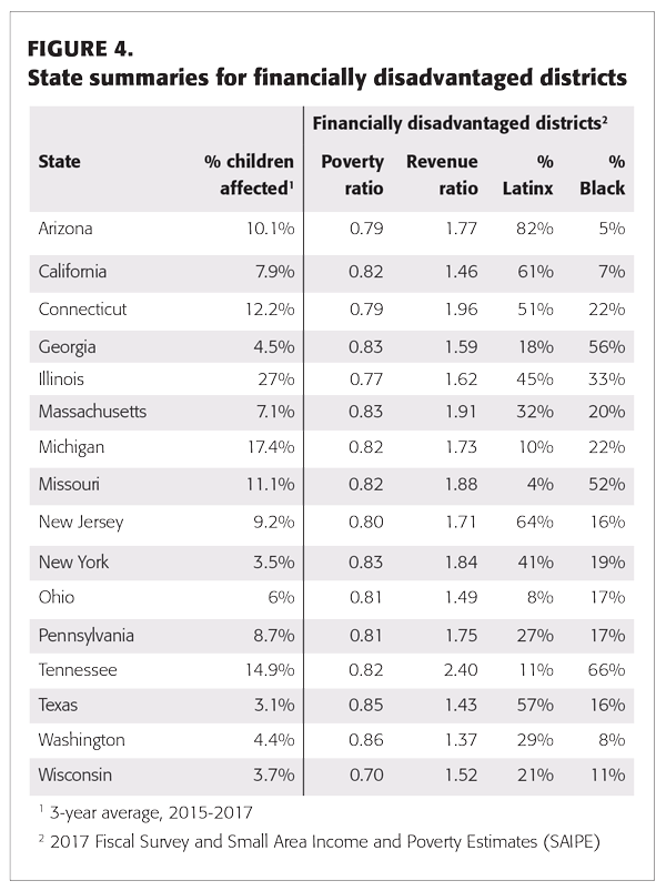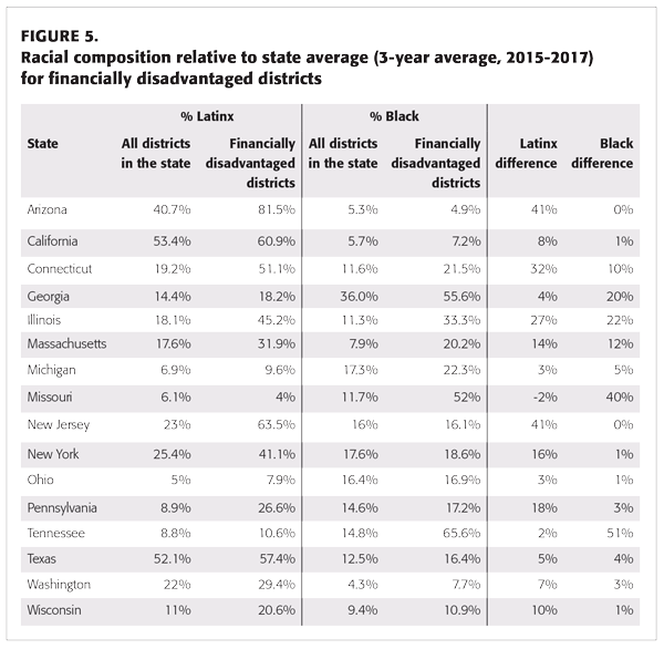In Figure 4, we provide summary data for states with multiple districts — and significant numbers (>50,000) of students — that are severely disadvantaged relative to their neighbors. Note that in Arizona, Connecticut, Illinois, Michigan, Missouri, and Tennessee, more than 10% of all students in the state live in financially disadvantaged districts. In Illinois, Missouri, and Tennessee, this is accounted for largely by those states’ predominantly Black major urban centers (Chicago, St. Louis, and Memphis/Shelby County). However, in Arizona and Connecticut — as in California, New Jersey, and Texas — financially disadvantaged school districts tend to be majority Latinx. (This may not be surprising in Arizona, California, and Texas, where Latinx student enrollments are large across the board, but that is not the case in New Jersey and Connecticut.)