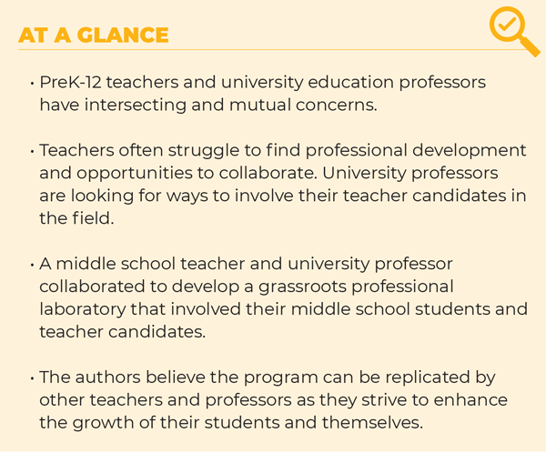 A middle school teacher and a university professor offer a model for how teachers and teacher educators can build an ongoing local professional laboratory