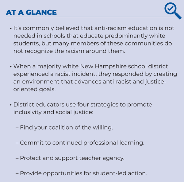 A predominantly white school district responds to a racist incident by embracing social justice and anti-racist teaching and leadership.