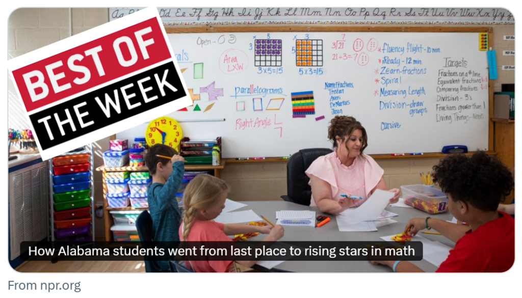 Speaking of covering the real story: The best education journalism of the week is How Alabama students went from last place to rising stars in math by NPR’s Cory Turner, part of a series about successful schools in the south. Here’s another about reading in Louisiana.